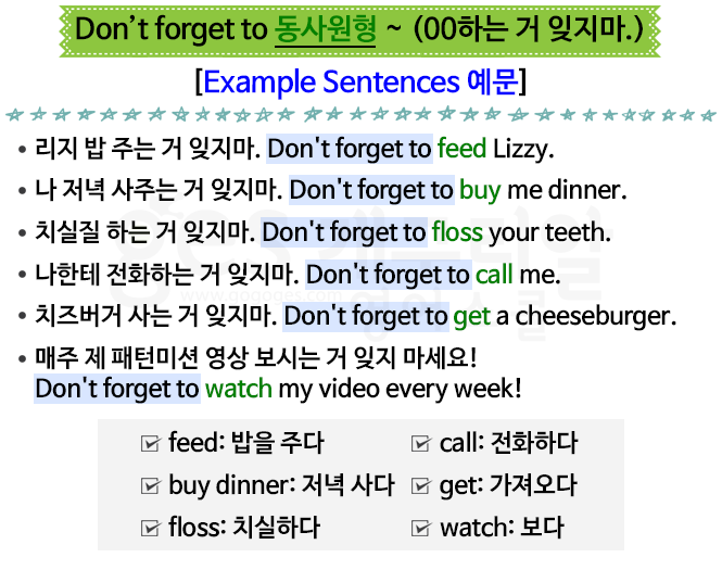 Don't forget to do your homework. 숙제하는거 잊지마!!!