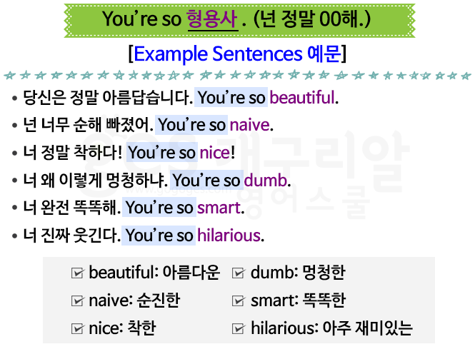 You're so beautiful! 너는 정말 아름다워. You're so패턴을 딱 봤는데 그게 딱 생각나더라구요 ㅋㅋㅋ
