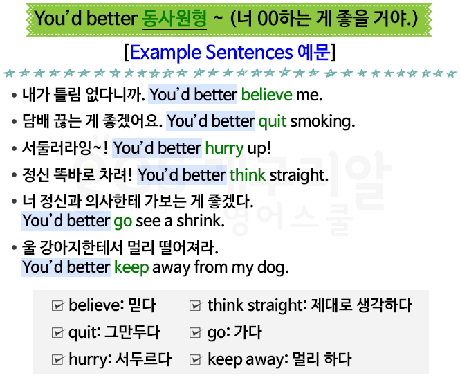 You'd better lose your weight! 살빼는게 좋을거야.(겨울이라서 살더찐다는 ㄷㄷ) 개구리알영어스쿨 첫 오픈떄부터 첫 패턴댓들때 부터 쭉 해왓는데 그때가 5월 20일이엇던것가튼데 ㅋㅋㅋㅋ 벌써 12월이네요!!! 개구리알영어스쿨 화이팅!!!!