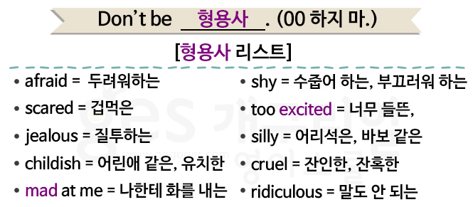 박주연님,『Don't be 형용사』패턴 확실하게 이해하셨네요~ Bravo!★ 비슷한 의미의 표현들로, "바보같이 굴지마." Don't be foolish. "터무니없이 굴지마. 말고 안되는 소리 하지마." 는 Don't be ridiculous. Don't be absurd. 도 있다는 점, 참고 하시길~ ^^*