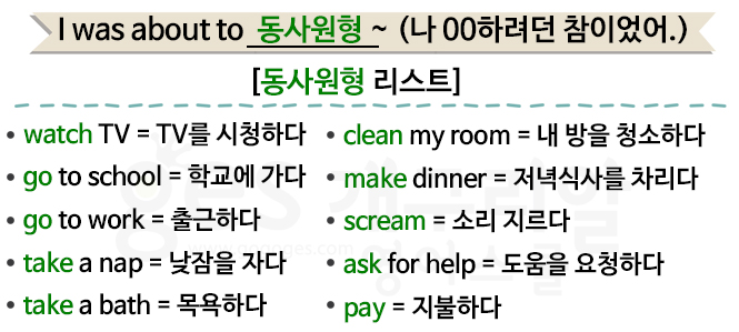 김도은님,「 I was about to~」는 "~하려던 참이었어." 란 의미죠? 즉 지금 막 "○○하려던 참이었다." 라고 말할 때나 어떤 일이 있었을 당시 "난 ○○하려던 참이었어." 라고 말할 때 쓰여요. 그래서 이렇게 과거 어느 시점, on Friday night 이라는 표현과 같이 쓰는건 어울리지 않아요. I was about to go to church. (O) 또는 I was about to go to church when you called. (O) [너가 전화 했을 때, 난 막 교회에 가려던 참이었어.] 이렇게 쓰셔야 해요. *^^*