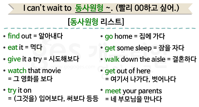 조원경님, 문장을 잘 완성하셨는데요, 한가지 주의할 점 알려드릴게요. ^^* "화장실 가다"는 영어로 go to the washroom 이라고 하고요, 캐나다에서는 washroom을, 미국에서는 bathroom 또는 restroom을 더 많이 쓴다는 점도 참고 하세요! ^^* I can't wait to go to the washroom. I can't wait to go to the bathroom.I can't wait to go to the restroom. ^___^