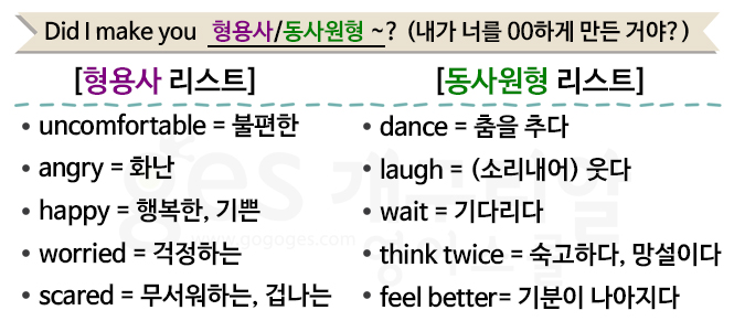 서희민님, 이번 주 패턴미션 완수 성공! ☆ 이 질문과 함께 "내가 널 슬프게 만들었어?" "내가 널 기분 언짢게 만들었어?"라고 물어볼 수도 있겠죠? 이렇게요! Did I make you sad? = "내가 널 슬프게 만들었어?" Did I make you upset? = "내가 널 기분 언짢게 만들었어?" 참고하시길 바래요. ^___^